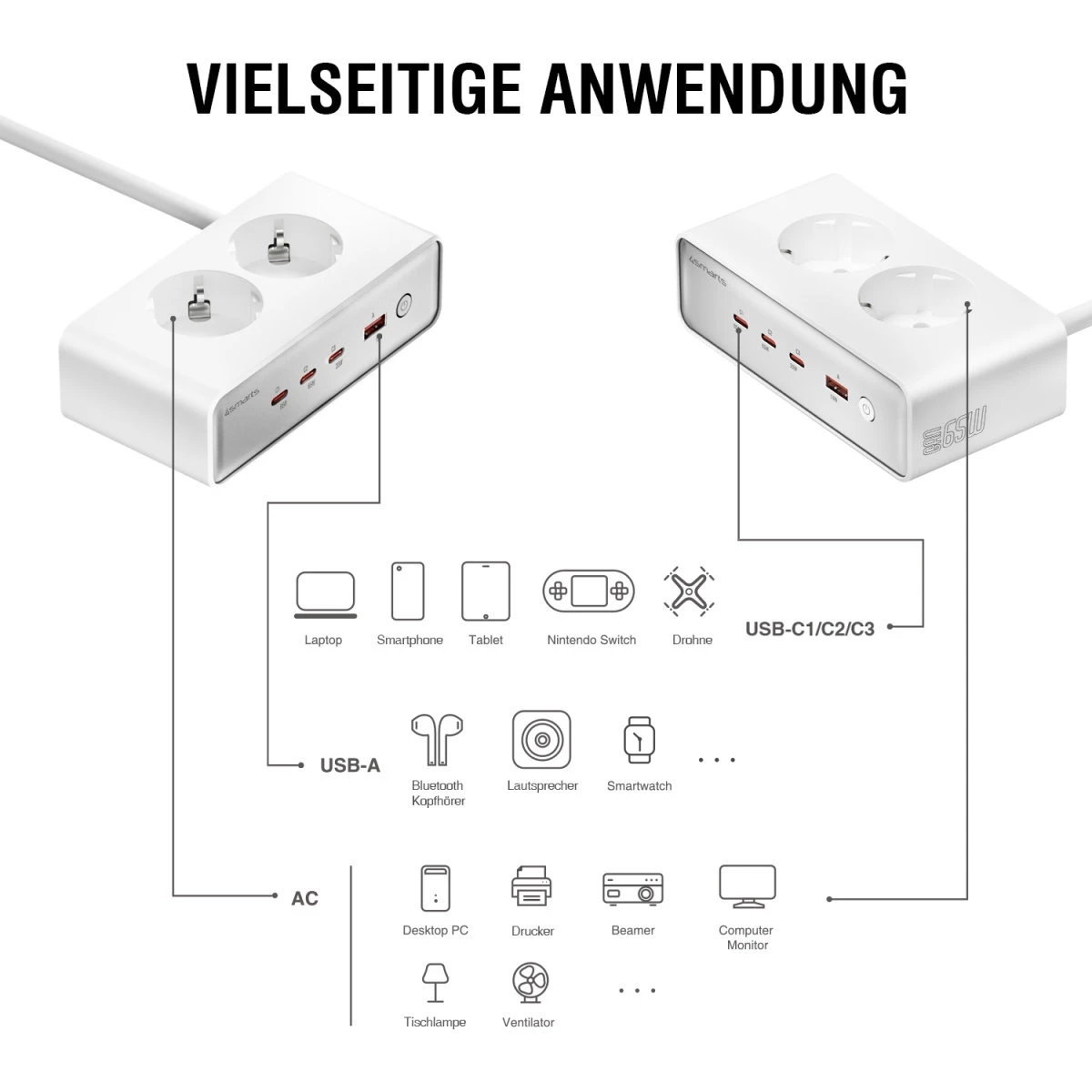 Mit 3 USB-C-Anschlüssen (bis zu 65W Power Delivery), 1 USB-A-Anschluss und 2 AC-Steckdosen (4000W) ist die 4smarts 6-in-1-Ladestation ideal, um all deine Geräte zu laden und zu betreiben. Egal ob Laptops, Tablets, Smartphones, Nintendo Switch, Bluetooth-Kopfhörer, Drucker, Beamer oder Desktop-PCs – diese vielseitige Stromzentrale sorgt dafür, dass du stets bestens ausgestattet bist.